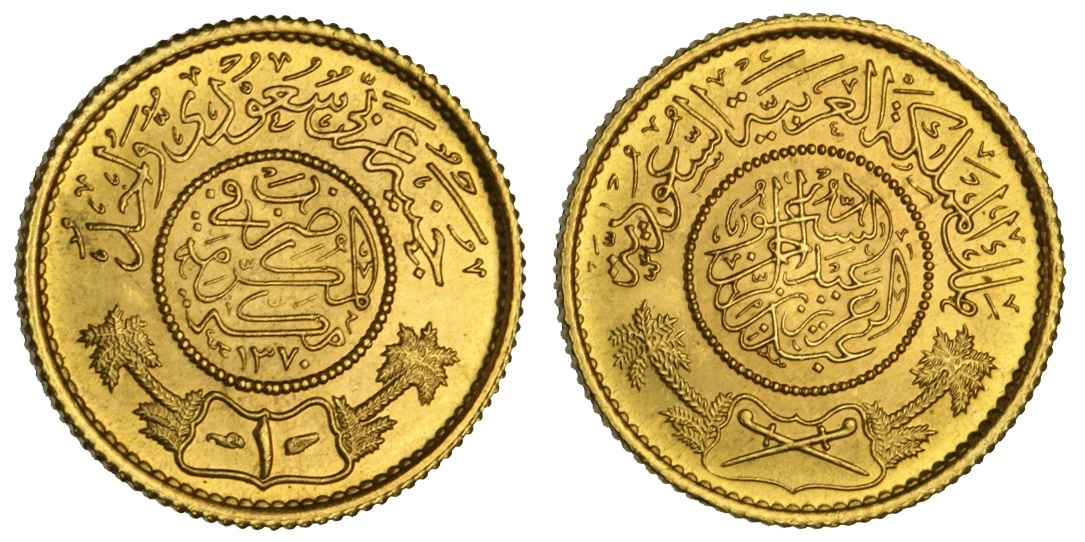 Saudi Arabia. `Abd al-`Aziz b. Sa`ud (AH 1344-1373/1926-1953 AD). Guinea, AH 1370. Legend in beaded central circles, crossed swords flanked by palms below, legend around. Numeral value below on reverse. KM 36. Choice Brilliant Uncirculated.
