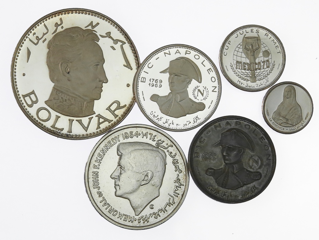 Sharjah. Khalid b. Muhammad al-Qasimi (1965-1972 AD). Complete Set of AH 1389 - 1970 Silver issues: Riyal, 2, 5 and 10 Riyals. Mona Lisa, Mexico World Cup, Napoleon, Bolivar. KM 2-5. Brilliant Proof; also another 5 Riyals, deep slate gray tone; and 5 Rupees, 1964. JFK. Brilliant Uncirculated. (6)