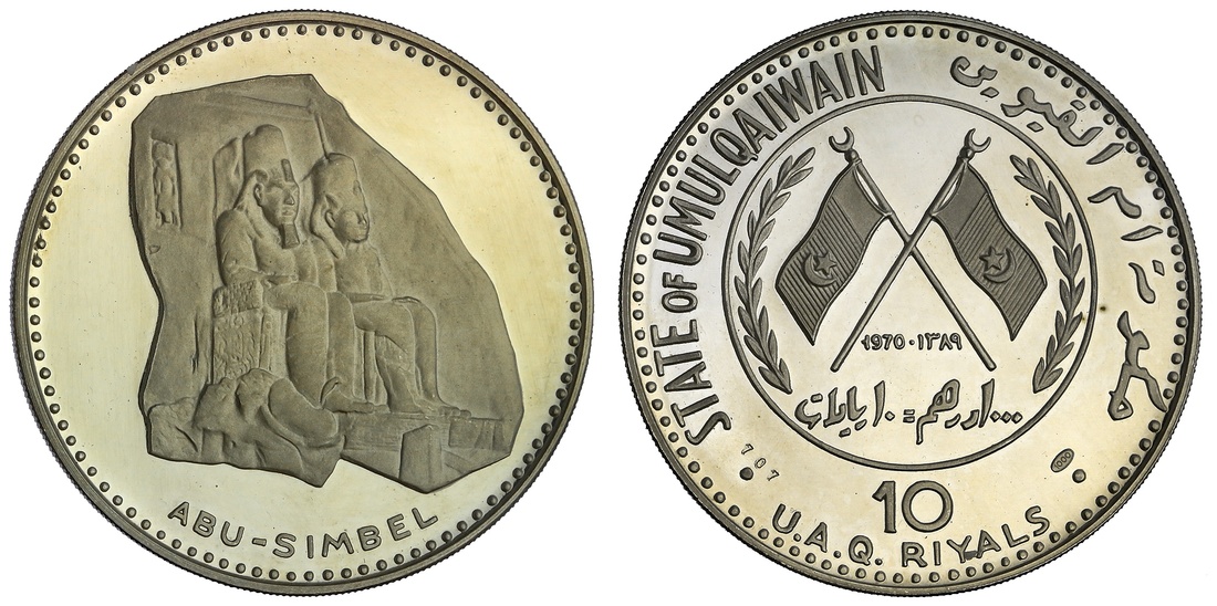 Umm al-Qaiwain. Ahmad b. Rashid al-Mualla (1929-1981 AD). 10 Riyals, AH 1389 - 1970. Façade of the Great Temple at Abu Simbel. KM 4. Light friction hairlines in obverse field. Brilliant Proof.