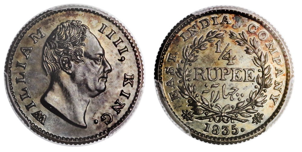 British India. East India Company. Regal Coinage. William IV (1830-1837). Silver Proof Restrike Quarter Rupee, 1835 (c). Type C/IV. Bare head right, raised F on truncation. Pridmore 92, KM 448.6. PCGS PR 65. Superb light hematite gray on mirrorlike fields.