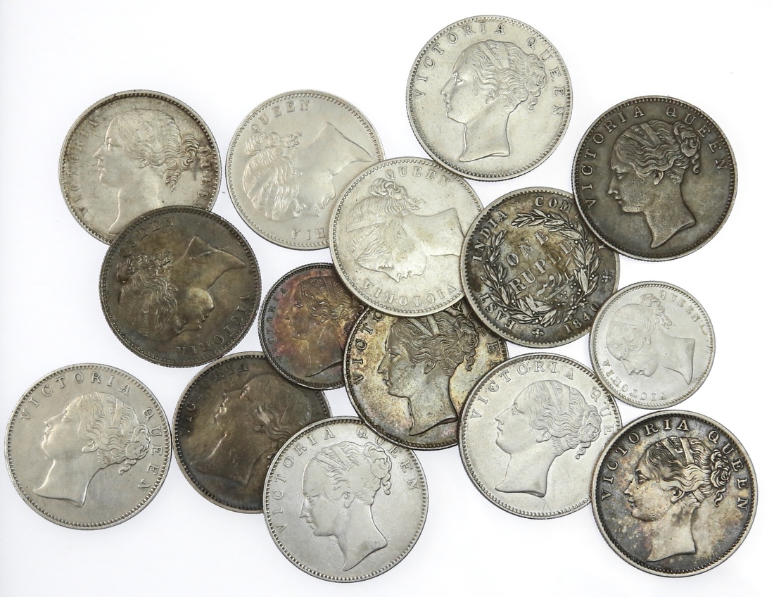 British India. East India Company. Regal Coinage. Victoria (1837-1901). Group of 1840 Rupees and Halves. Rupees - KM 457 (7), 458 (6). Fine-EF, a few cleaned or with some hairlines; Half Rupees - W.W. incuse, KM 456. One once cleaned EF, the other toned AU-Uncirculated. (15)