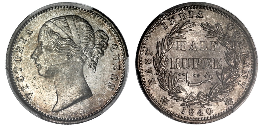British India. East India Company. Regal Coinage. Victoria (1837-1901). Half Rupee, 1840 (b&c). Type A/I. Young head left, W.W. incuse on truncation, rev. Value within wreath. KM 456.1, Pridmore 80. PCGS MS 63.