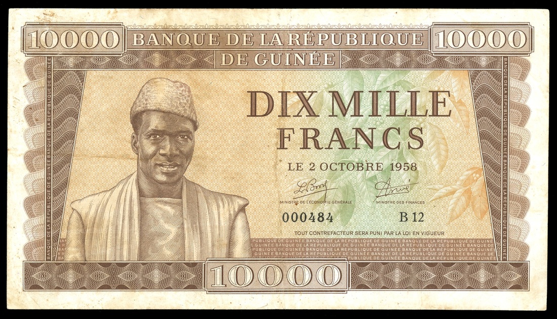 Guinea. Banque de la République de Guinée. 10,000 Francs. 1958. P-11. No. B12 000484. Brown, yellow-brown and green. Sekou Toure at left; Mining scene on back. About VF.