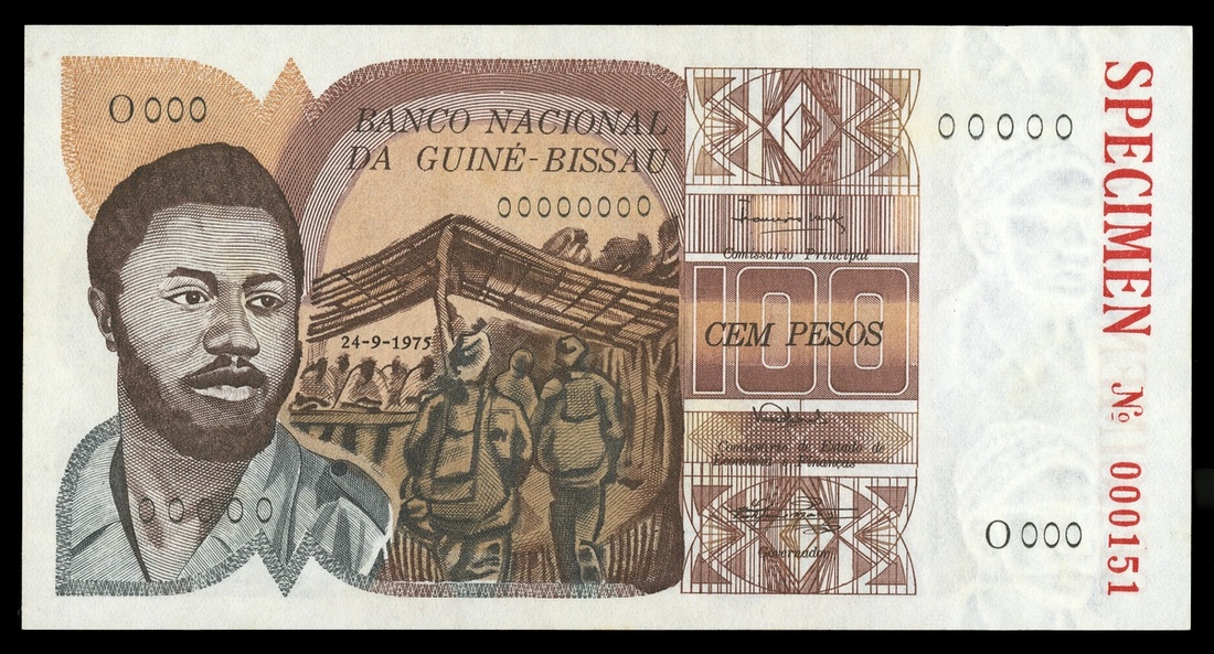 Guinea-Bissau. Banco Nacional da Guiné-Bissau. 100 Pesos. 1975. P-2s. Specimen. D. Ramos at left, gathering left center; woman and handicrafts on back. SPECIMEN No 000151 in red vertical in white borders. PMG Choice Uncirculated 64.