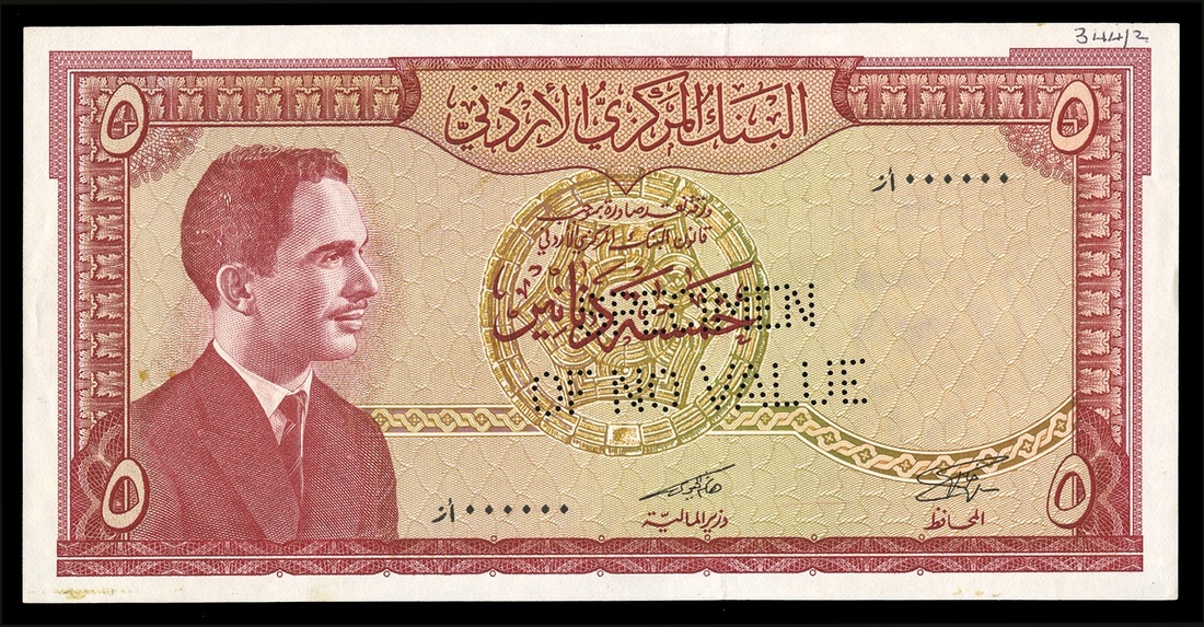 Jordan. Central Bank. 5 Dinars. Law of 1959. First series, without law date. P-15as. Specimen. No Z/I 000000. Red and olive-green. King Hussein at left; Al-Khazneh - the Treasury at Petra on back. Perforated SPECIMEN OF NO VALUE at center. Small ink annotation top right. Very minor glue residue at bottom margin. AU.