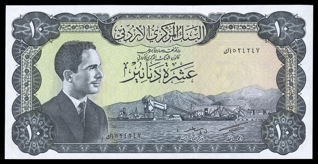 Jordan. Central Bank. 10 Dinars. Law of 1959. First series, without law date. P-16e. Blue gray. Signed Salem Massadeh; Said al Nabulsi. King Hussein at left, ships at Aqaba port; Baptismal site on the River Jordan on back. Crisp Uncirculated.