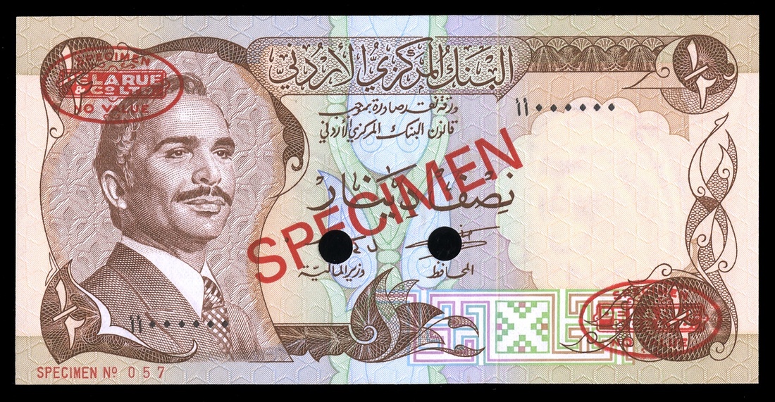 Jordan. Central Bank of Jordan. 1/2 Dinar. ND (1975-92). P-17s1. Specimen. No. AA000000-57. Brown on multicolor. King Hussein at left; Forum columns at Jerash on back. Diagonal red SPECIMEN, red oval DLR stamp top left, bottom right, single punch cancel twice. Choice Uncirculated.