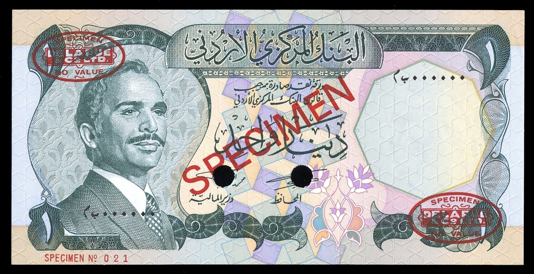 Jordan. Central Bank of Jordan. 1 Dinar. ND (1975-92). P-18s3. Specimen. No. MB 000000-21. Dark green on multicolor. King Hussein at left; Dome of the Rock on the back. Diagonal red SPECIMEN, red oval DLR stamp top left, bottom right, single punch cancel twice. Slight corner crease, AU.
