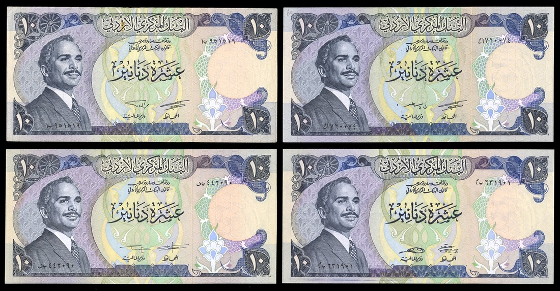 Jordan. Central Bank of Jordan. 10 Dinars. ND (1975-92). P-20a-d. All four signature varieties. Blue and purple on multicolor. King Hussein at left; Palace of Culture add Roman Amphitheatre on back. The second EF, the others Unc. [4]