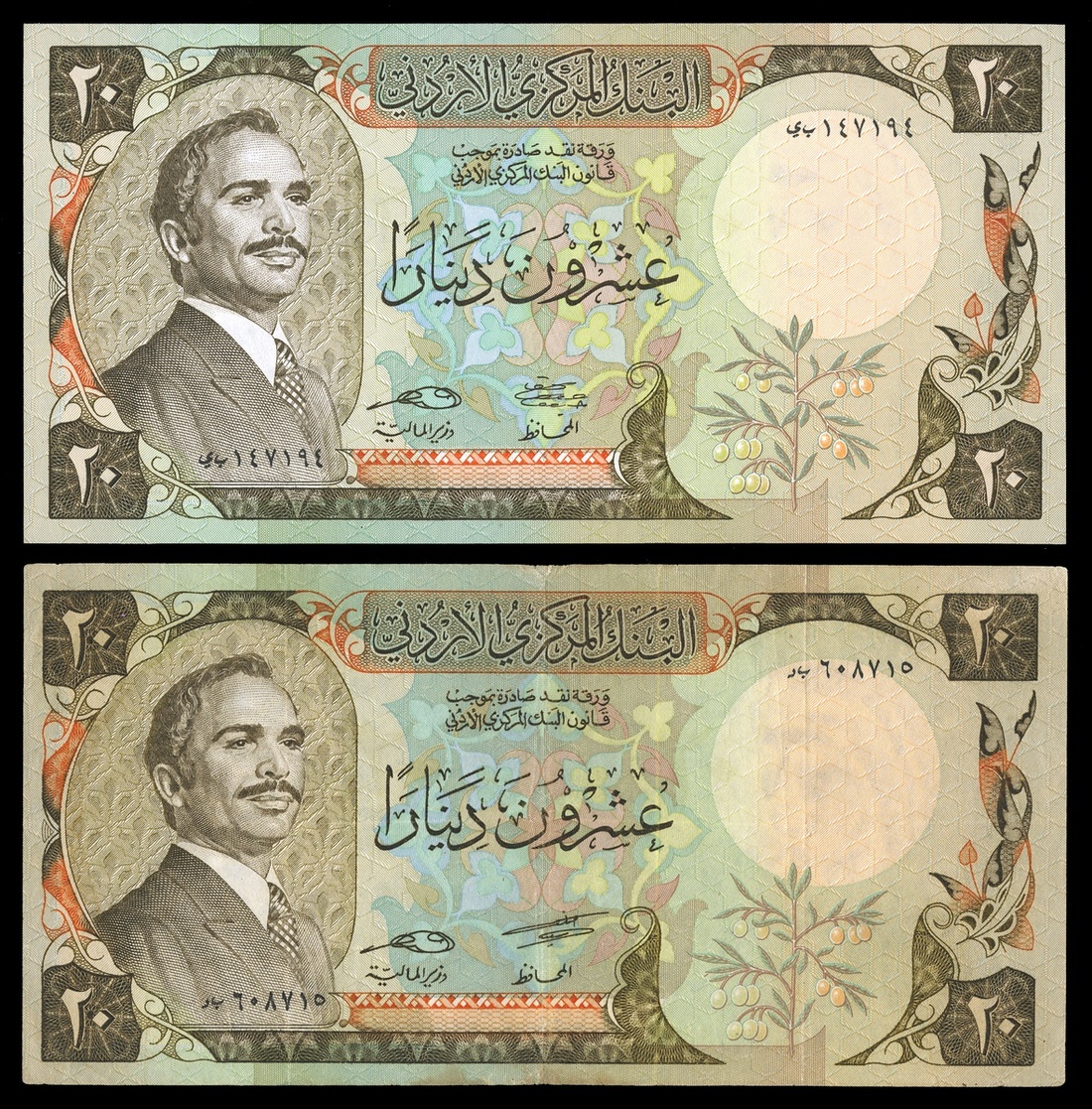 Jordan. Central Bank of Jordan. Quintet of 20 Dinars. 1977, 1981, 1985, 1988. P-21a-c. Deep brown on multicolor. King Hussein at left; Thermal Power Station of Zerga on back. The 1985 EF, the others Unc. [5]