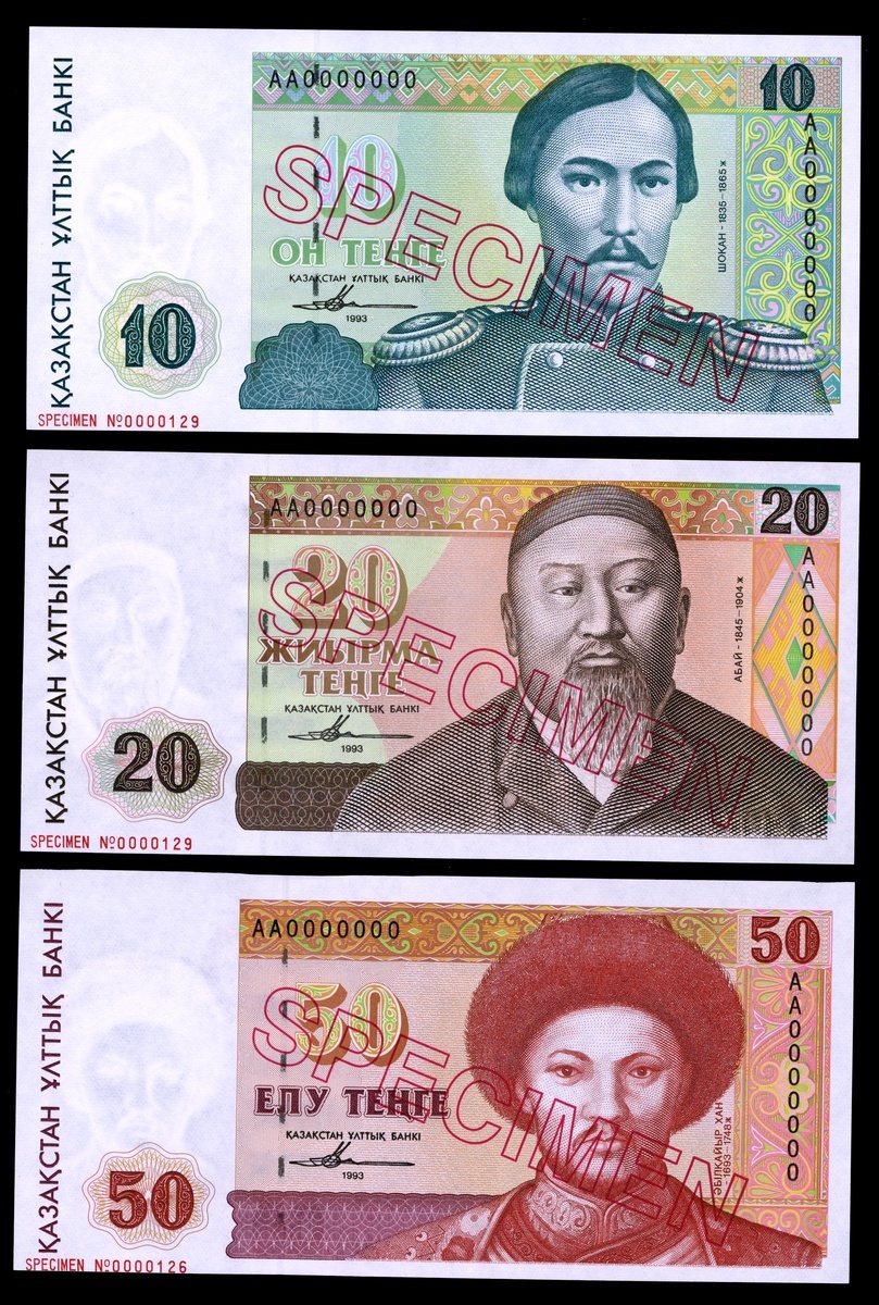 Kazakhstan. Republic. National Bank. 10, 20 and 50 Tenge. 1993. P-10s-12s. Specimen. Shoqan Valikhanov, Abai Kunanbaev, and Abulkhair Khan portraits at right. Red, hollow diagonal SPECIMEN. Crisp Uncirculated. [3]
