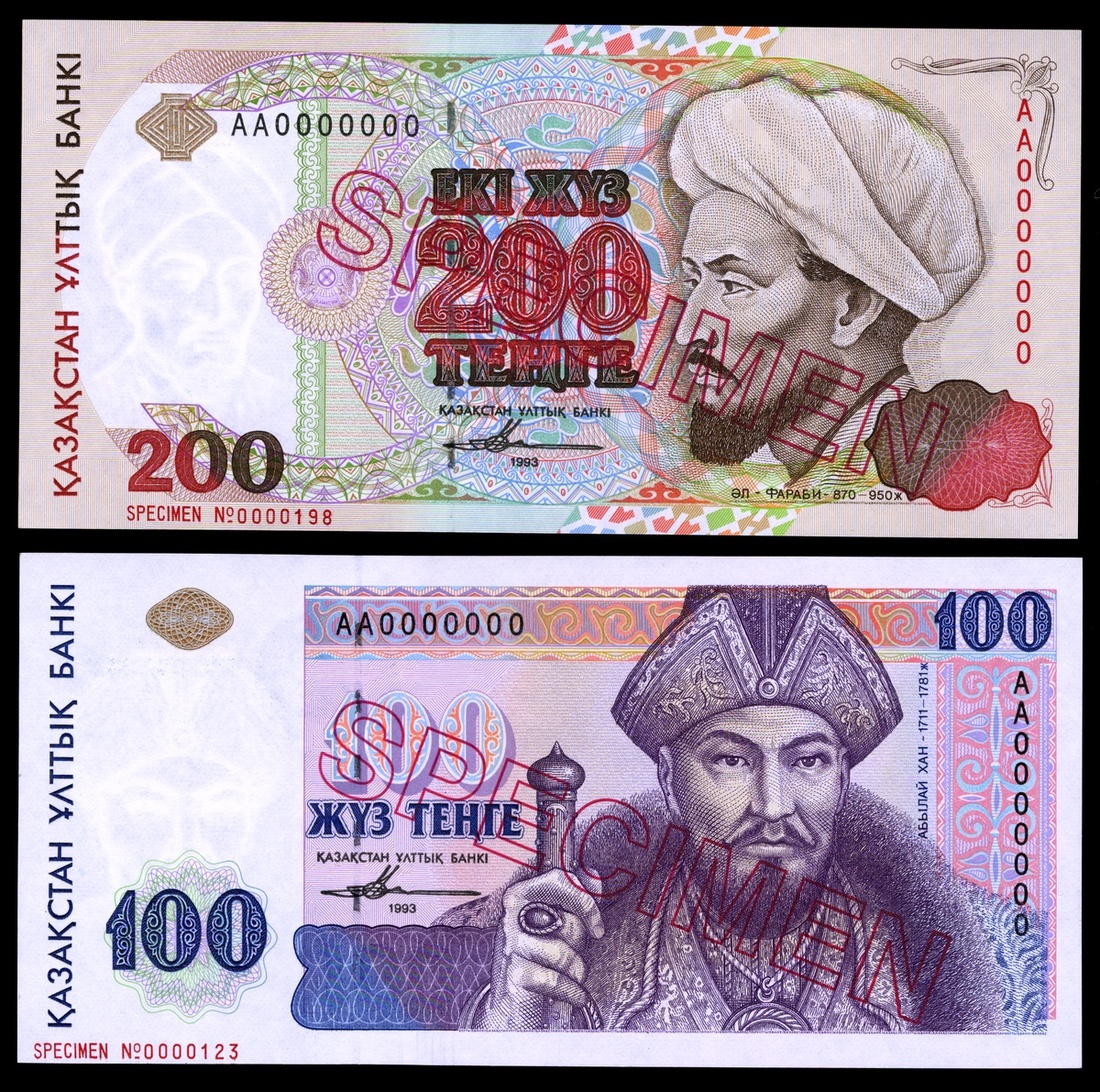 Kazakhstan. Republic. National Bank. 100 and 200 Tenge. 1993. P-13s, 14s. Specimen. 18th Century leader Ablai Khan, medieval philosopher al-Farabi portraits at right. Red, hollow diagonal SPECIMEN. Crisp Uncirculated. [2]