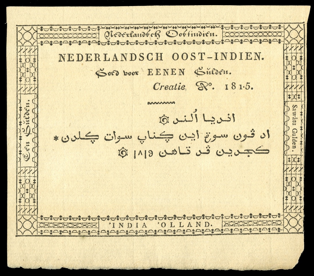 Netherlands East Indies. Government - State Notes. 1 Gulden. 1815. P-1r. White. Border with pseudo musical notation. Remainder. Lightly age toned. Uncirculated.