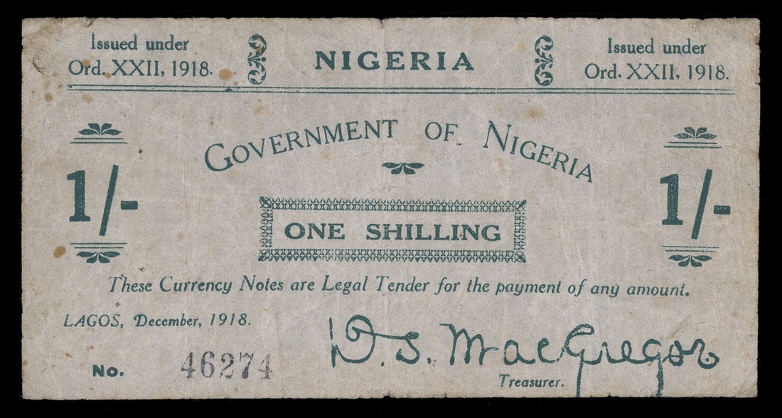 Nigeria. British Administration. Government of Nigeria. 1 Shilling. December 1918. P-1. No. 46274. Green. Rare. PMG Very Fine 20.