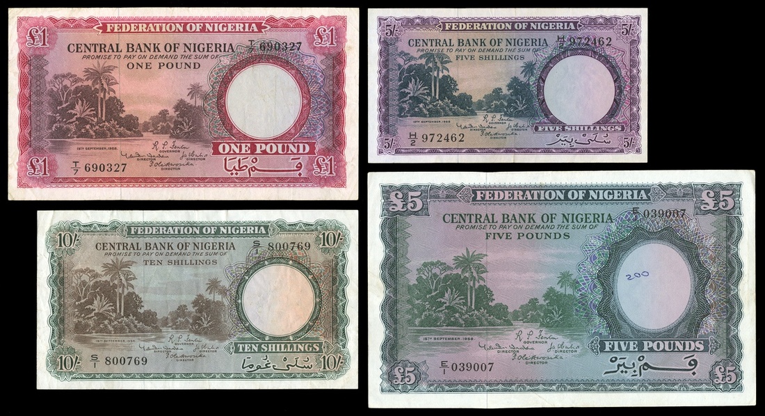 Nigeria. Federation of Nigeria. Central Bank. 1958 issues. 5 and 10 Shillings, 1 Pound and 5 Pounds. P-2a-5a. River scene and palms. AU, About VF, VF and EF with graffiti number. [4]
