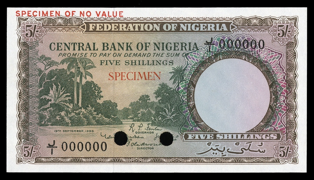 Nigeria. Federation of Nigeria. Central Bank. 5 Shillings. 1958. P-2ct. Color Trial Specimen. No. J/I 000000-142. Brown, lilac, and blue-green. Riverscene and palm trees; Palms on back. Horizontal red SPECIMEN, SPECIMEN OF NO VALUE top margin. Single punch cancel bottom center left and right. Crisp Uncirculated