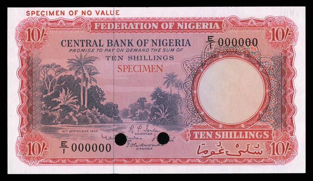 Nigeria. Federation of Nigeria. Central Bank. 10 Shillings. 1958. P-3ct. Color Trial Specimen. No. E/I 000000-125. Red. Riverscene and palm trees; Men sowing crops, man holding groundnuts on back. Horizontal red SPECIMEN, SPECIMEN OF NO VALUE top margin. Single punch cancel bottom center left and right. Crisp Uncirculated.