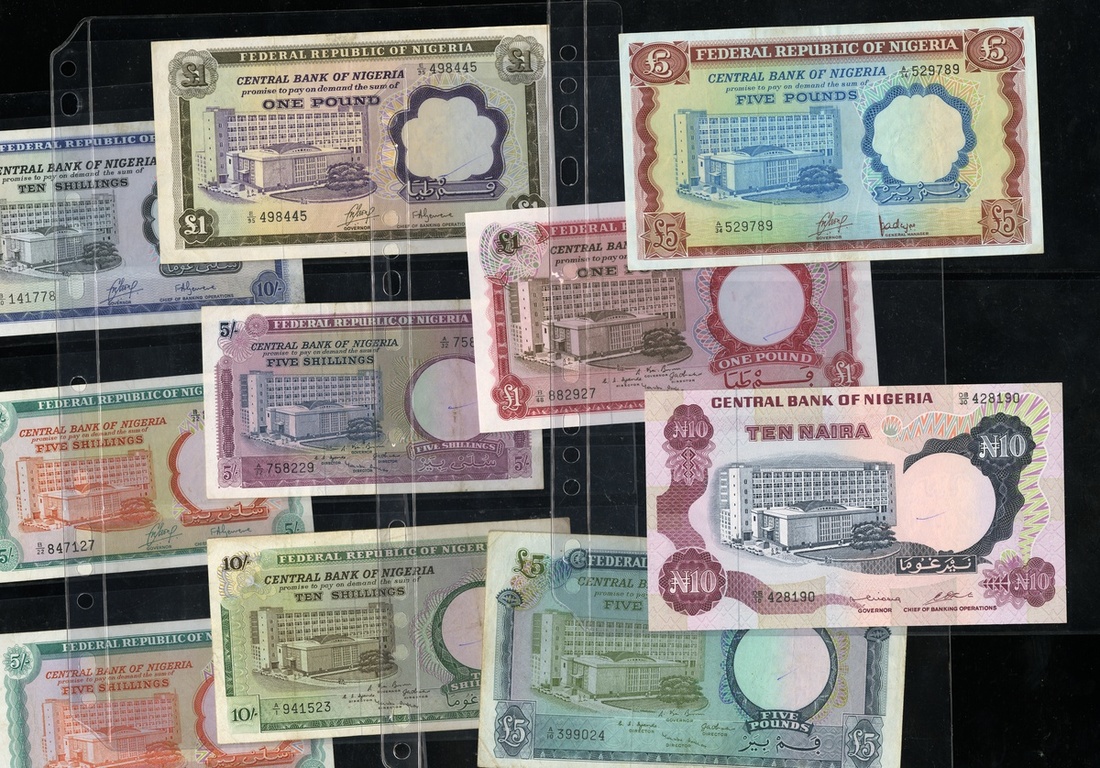 Nigeria. Federal Republic. Central Bank. 1968 ND issues: 5 Shillings. P-10a, b. EF-AU; 10 Shillings. P-11b. VF; 1 Pound. P-12b. VF-EF; 5 Pounds. P-13a. VF; and ND (1973-8 issue). 10 Naira. P-17b. Unc.; also 1967 ND issues - 50 and 10 Shillings, 1 Pound and 5 Pounds. The Pound Unc, the others VF, the later with graffiti. [10]