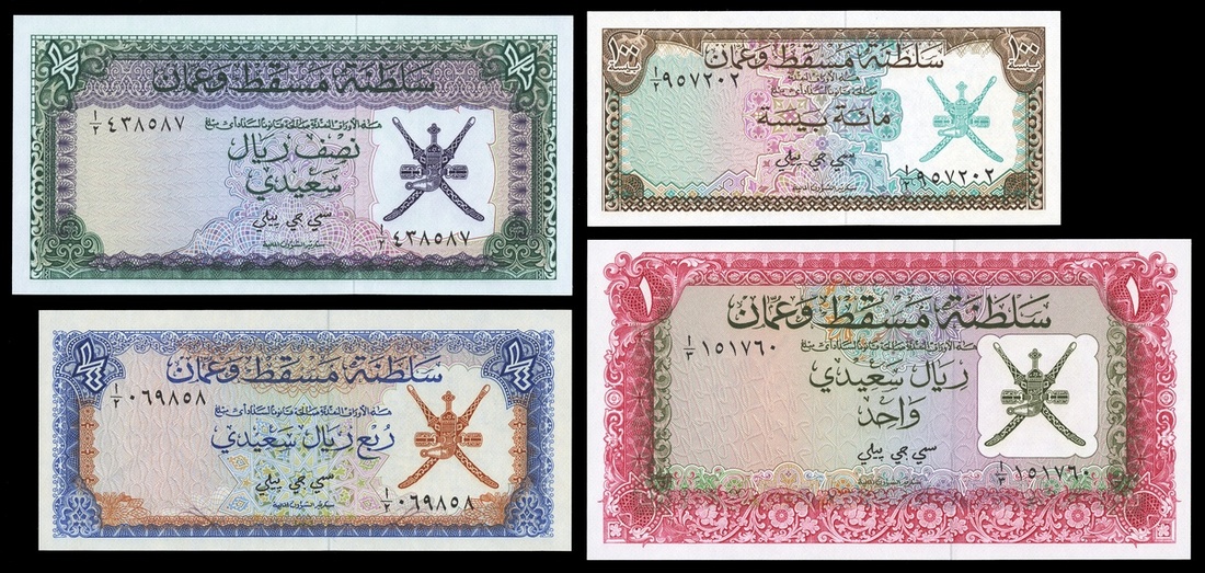 Muscat and Oman. Sultanate. 100 Baiza, ¼, ½ Rial Saidi, and 1 Rial Saidi. ND (1970). P-1a-4a. Arms - Oman khanjar and crossed swords at right. Choice Uncirculated. [4]