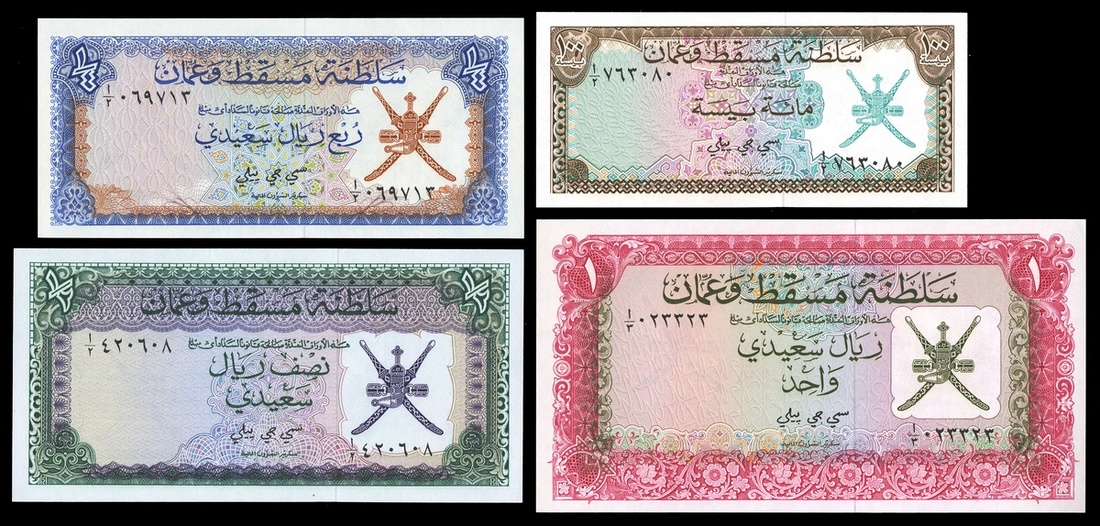Muscat and Oman. Sultanate. 100 Baiza, ¼, ½ Rial Saidi, and 1 Rial Saidi. ND (1970). P-1a-4a. Arms - Oman khanjar and crossed swords at right. Choice Uncirculated. [4]