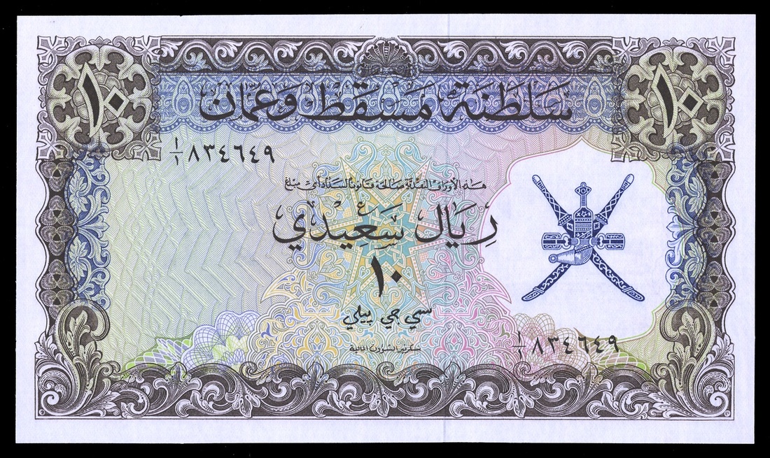 Muscat and Oman. Sultanate. 10 Rials Saidi. ND (1970). P-6a. No. A/1 834649. Dark brown and blue on multicolor. Arms - Oman khanjar and crossed swords at right; Mirani Fort on back. Choice Uncirculated.