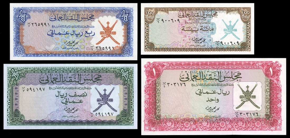 Oman. Sultanate. Oman Currency Board. 100 Baiza, ¼, ½ Rial Omani and 1 Rial Omani. ND (1973). P-7a-10a. Arms - Oman khanjar and crossed swords at right. Choice Uncirculated. [4]