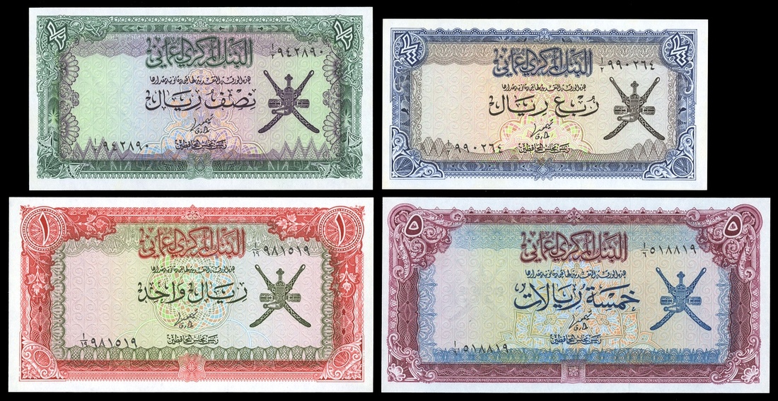 Oman. Sultanate. Central Bank of Oman. 100, 200 Baisa, ¼, ½ Rial, 1, 5 and 10 Rials. ND (1976-77). P-13-19. Arms - Oman khanjar and crossed swords at right. Crisp Uncirculated. [7]