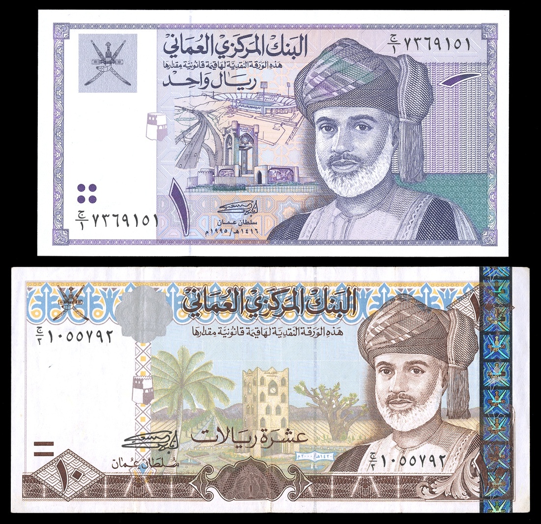 Oman. Central Bank. 1989-2000 issues: 1989 -- 1/4 and 1 (2) Rial. P-24, 26; 1995 - 100 (3), 200 Baisa, ½ (2) and 1 Rial (2), 5 and 10 Rials. P-31-34, 35b, 36; 2000 - 10 Rials. P-40. The last and one of the 1989 1 Rials VF, the rest Unc. [14]