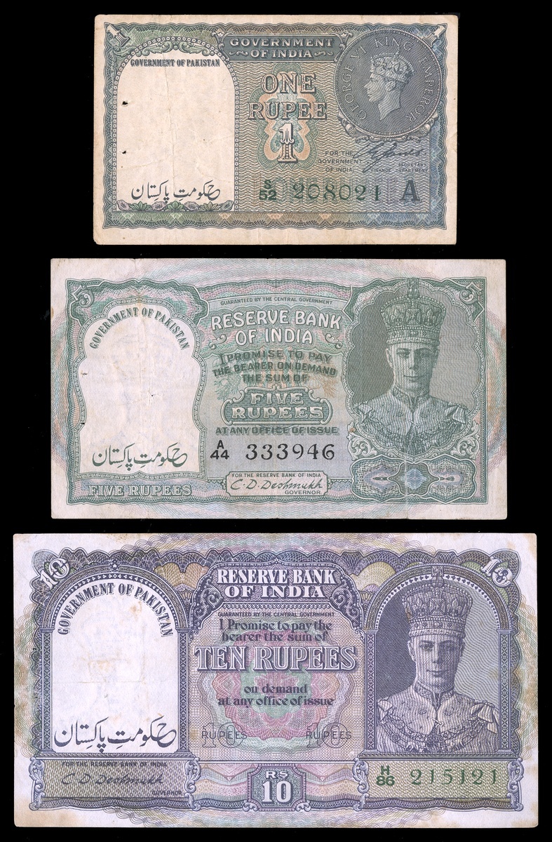 Pakistan. Another 1948 Provisional Issues group. P-1 (2) Fine-VF; VF; P-1A. Edge tear, VG; P-2 (2),VF details, tear repaired with tape, Fine with rent in wmk area; ; P-3 (2), Very Fine, with some age toning in the margins, and VF with additonal stapleholes. [7]
