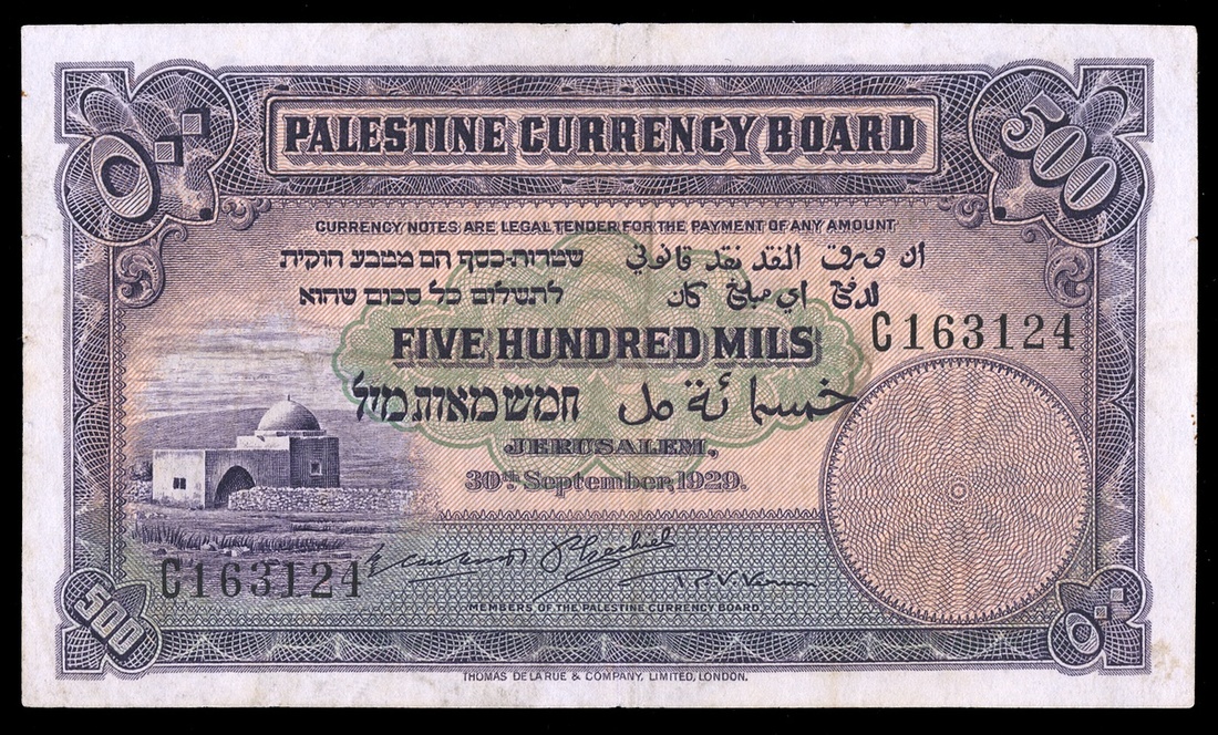 Palestine. Palestine Currency Board. 500 Mils. 30 September 1929. P-6b. No. C163124. Purple on green. Rachel's Tomb near Bethlehem; Tower of David (Citadel of Jerusalem) on back. TDLR. Small edge split repaired, Very Fine.