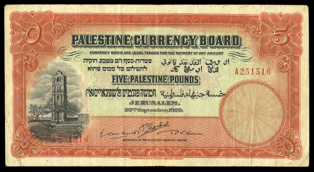 Palestine. Palestine Currency Board. 5 Pounds. 1929. P-8b. No. A 251516. Red and black. Crusader's Tower in Ramleh at left; Tower of David on back. TDLR. ICG F/VF 25*, toning, stains, multiple pinholes.