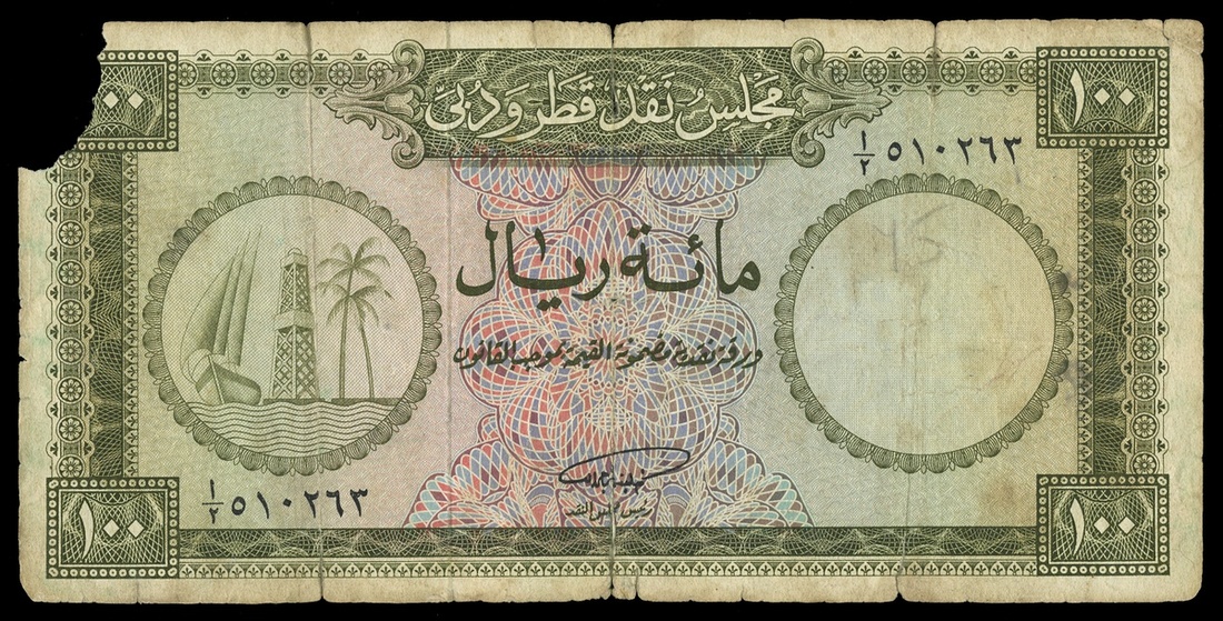 Qatar and Dubai. Currency Board. 100 Riyal. ND (1966). P-6a. No. A/2 510263. Olive on multicolor. Arms with dhow, oil derrick and palm at left; Geometric design on back. Very scarce. Fine details. Top left corner missing, numerous small edge splits, number penciled at front right.