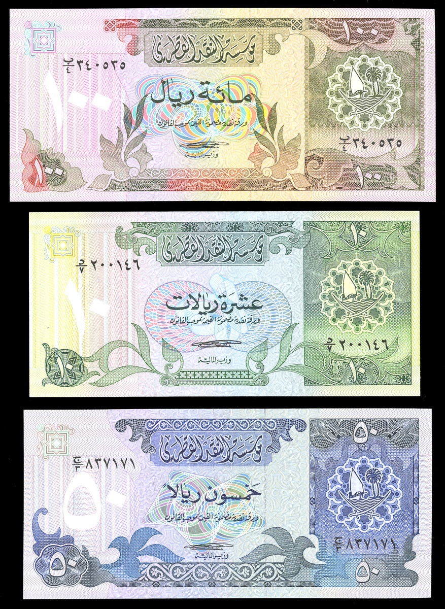 Qatar. Monetary Agency. ND (1980's) Issue -- 1, 5 (2), 10, 50, 100, and 500 Riyals. P-7 to 12. Arms at right; commercial and agrarian scenes on back; also, ND (1985) 1 Riyal (2). P-13. The 500 Riyals, Choice VF, the others Crisp Uncirculated. [9]