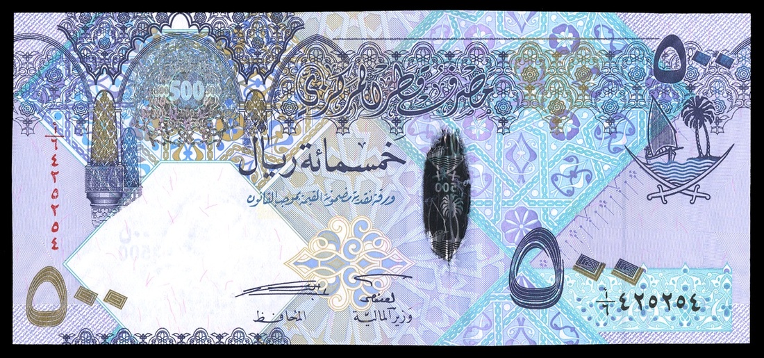 Qatar. Central Bank. 500 Riyals. ND (2003). P-25. Light and dark blue and violet on multicolor. Arms at right, holographic emblem upper left; Royal Palace, al-Wajbah Fort and smaller falcon head on back. Solid and Optiks security threads. Choice Uncirculated.