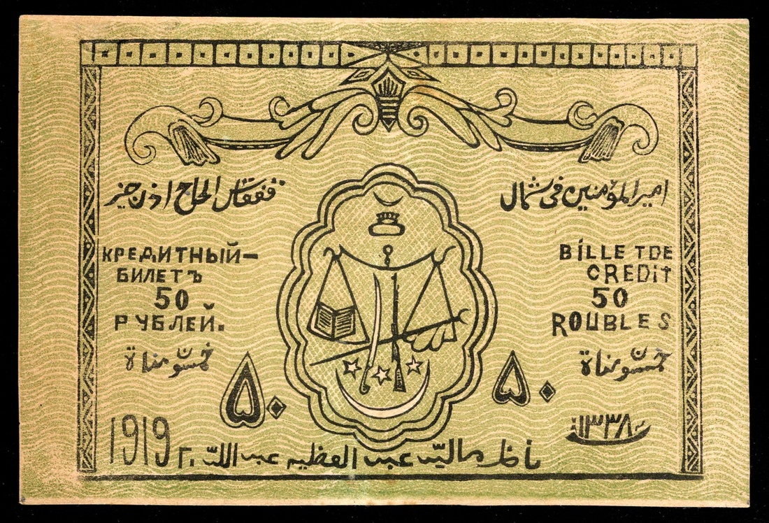 Russia. North Caucasus. North Caucasian Emirate. Credit Note. 50 Rubles. AH 1338 - 1919. P-S473. Scales at center; Flag set on mountain on back. Uncirculated.