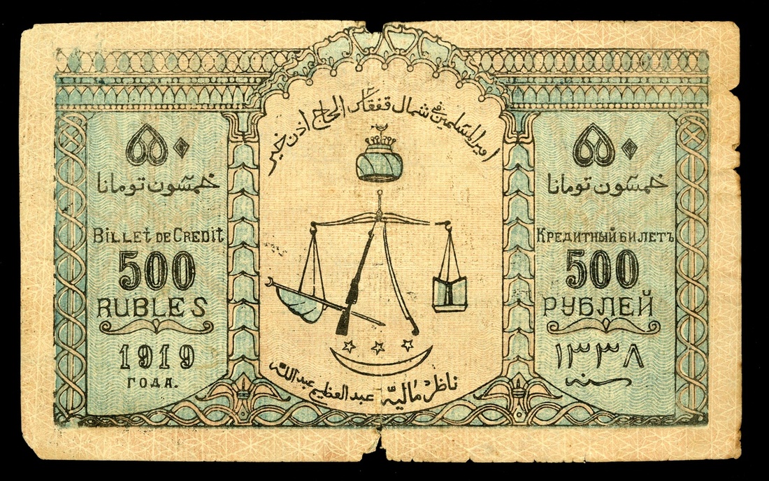 Russia. North Caucasus. North Caucasian Emirate. Credit Note. 500 Rubles. AH 1338 - 1919. P-S477a. Black on light blue and brown. Scales at center; Mountain at right, radiant sun at left on back. Small pieces out of margin, junction split, tear bottom center, VF.