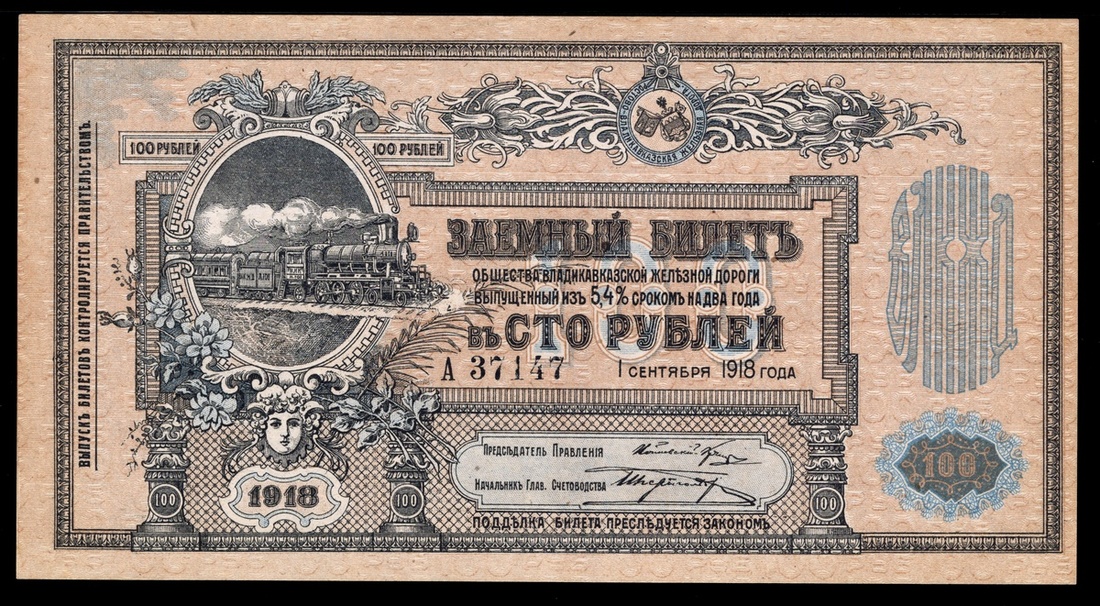 Russia. North Caucasus. Vladikavkaz Railroad Company. 100 Rubles. 1918. P-S594. Black on pinkish-brown and light blue. Passenger train steaming at left; Map of the Caucasus on the back, showing the railroad's main line from Rostov on the Don to Petrovsk and Baku. PMG Choice Uncirculated 64 EPQ.