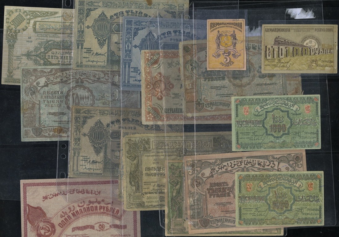 Russia. Transcaucasia. Azerbaijan Socialist Soviet Republic. 1920-1923. Type set, missing only the large format 1000 Rubles, with some duplicates. 5 to 5 Million Rubles. P-S709, 710, 712 (2), 713, 714, 715, 716 (2), 717 (4), 718, 719, 720. A few with light pencil number. One VG, the rest Fine-AU. [16]