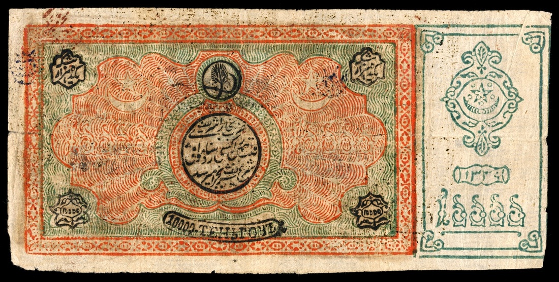 Russian Central Asia. Bukhara. Soviet Peoples Republic. 10,000 Tengas. AH 1339 (1920). P-S1034b. Orange-red and green, multicolor back. Star and crescent in compartmented right, cotton branch and sickle at tope center. Edge split with repair, VF.