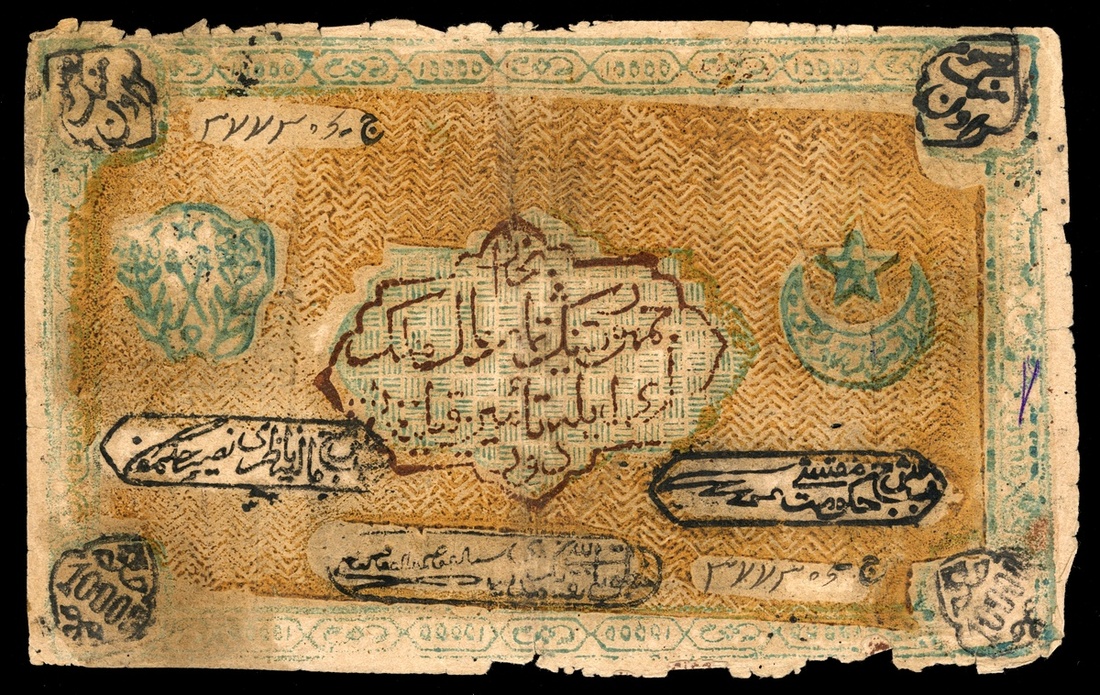 Russian Central Asia. Bukhara. Soviet Peoples Republic. 10,000 Sum - Rubles. AH 1340 (1920). P-S1040. Green star and crescent to right of central cartouche. Nibbled, ragged edge, a few tiny rents, VG-Fine.