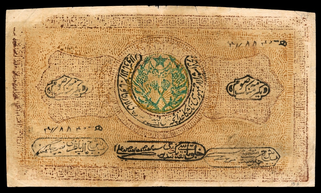 Russian Central Asia. Bukhara. Soviet Peoples Republic. 20,000 Rubles. 1921. P-S1041. Reddish-brown with green Arms at center. Crude VF.