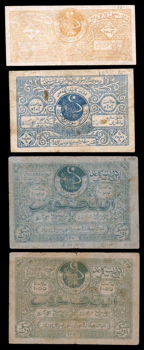 Russian Central Asia. Bukhara. Soviet Peoples Republic. 1, 5 and 10 Sum - Rubles AH 1340 - 1922. P-S1046, 1047, 1048 (2). Crescent and star above sickle and branch bundle at center. Two examples of the 10 Rubles. Three with number penciled at edge, the 5 Rubles light stain. Fine-About VF. [4]