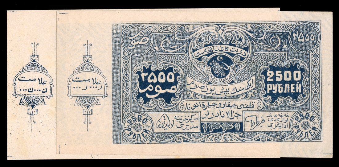 Russian Central Asia. Bukhara. Soviet Peoples Republic. Pair of 2,500 Sum - Rubles. -1922. P-S1052. Blue. Sickle and crescent with star upper center. Thick - diamonds with horizontal lines wmk, and thin paper- wavy line wmk. Uncirculated. [2]
