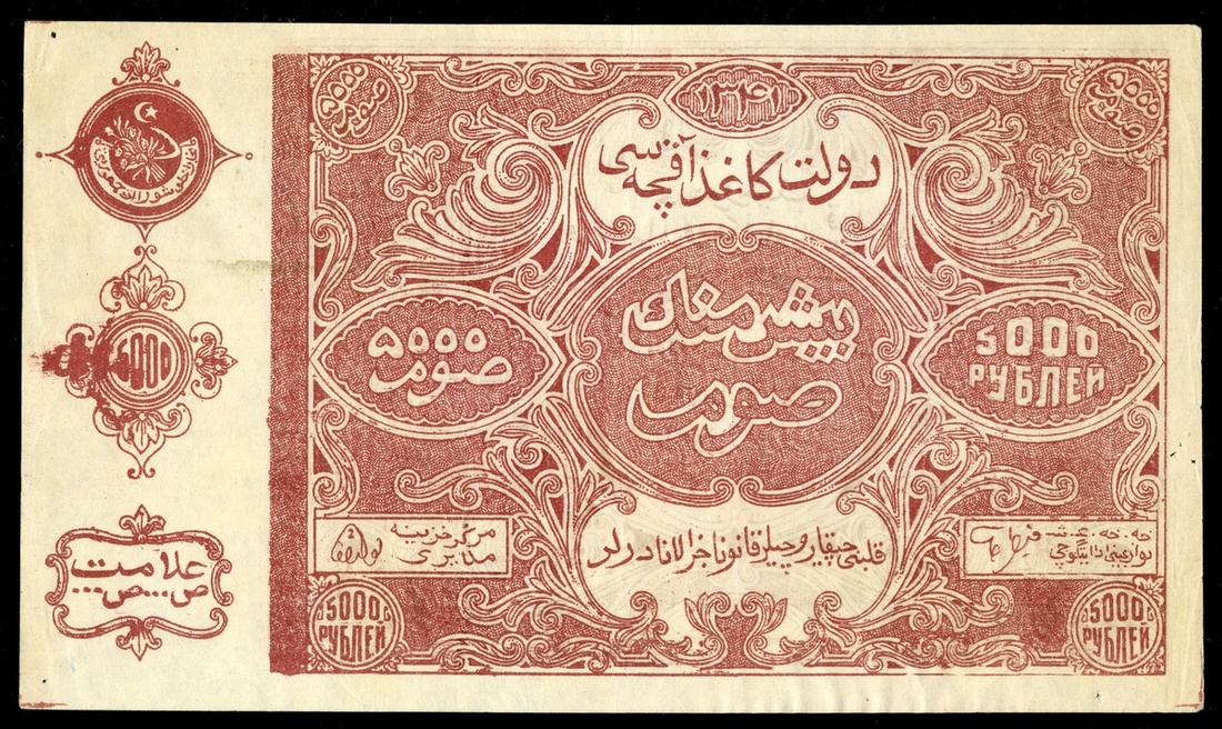 Russian Central Asia. Bukhara. Soviet Peoples Republic. 5,000 Sum - Rubles. 1922. P-S1053. Red-brown. Calligraphy in ornate cartouches. ICG Extra Fine 45*, small tears and pinholes at corners and right edge.