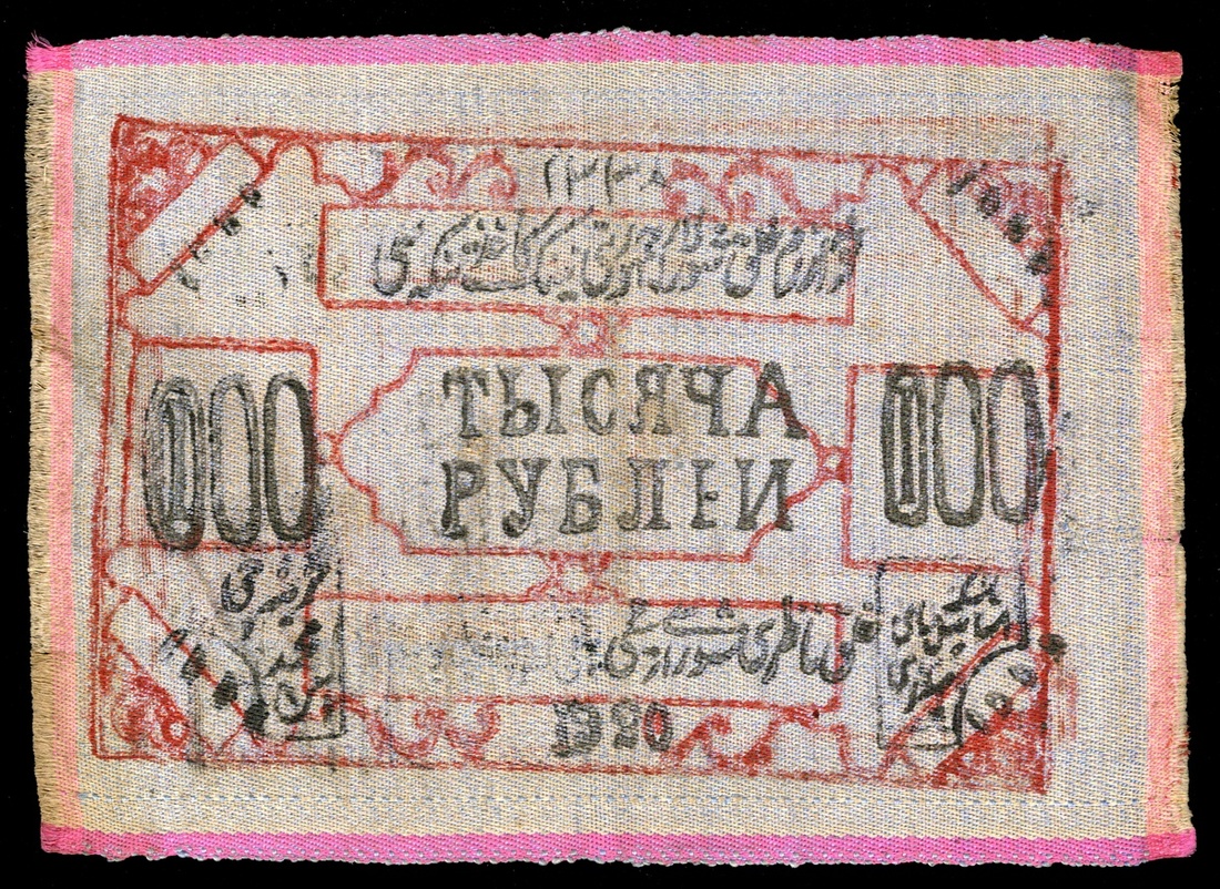 Russian Central Asia. Khorezmian Peoples Soviet Republic. 1000 Rubles. 1920. P-S1078. Silk. Red and black on gray; with violet, pink borders. EF.