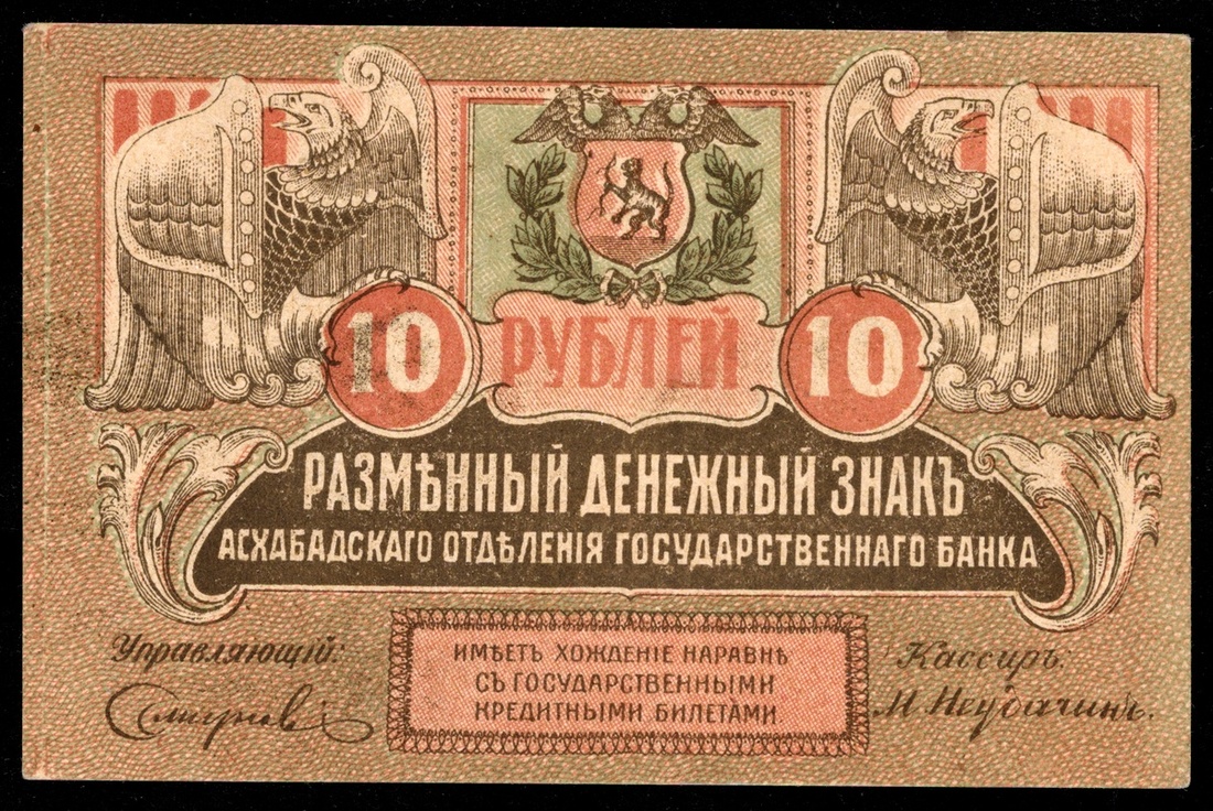 Russian Central Asia. Transcaspian Region. Government Bank. Ashkabad. 10 Rubles. 1919. P-S1136. Red, brown and green. Arms upper center, eagle left and right. Uncirculated.
