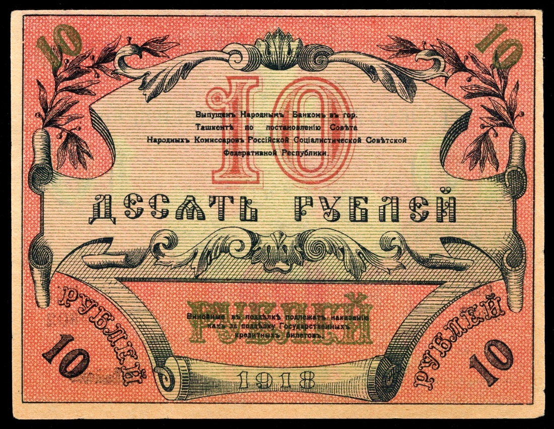 Russian Central Asia. Turkestan District. Provisional Credit Note. 10 Rubles. 1918. P-S1165a. Black on red and green. Woman's bust on pedestal on back. Uncirculated.