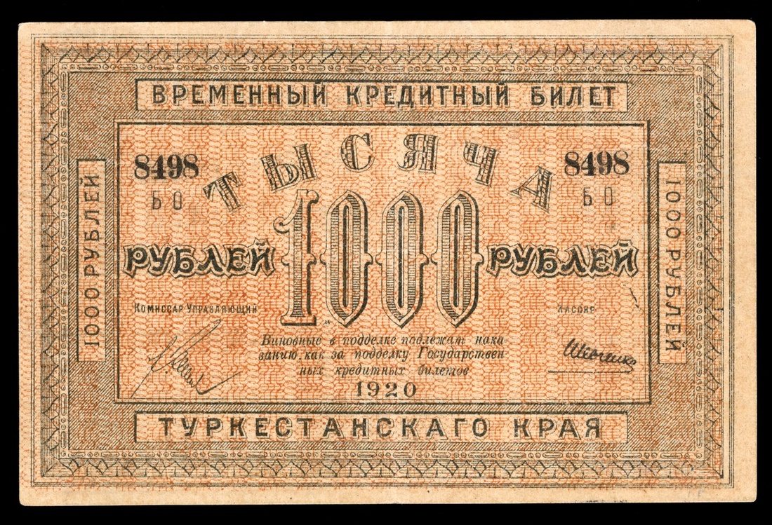 Russian Central Asia. Turkestan District. Provisional Credit Note. 1000 Rubles. 1920. P-S1173. Black on light red-brown. Arms back left. AU.
