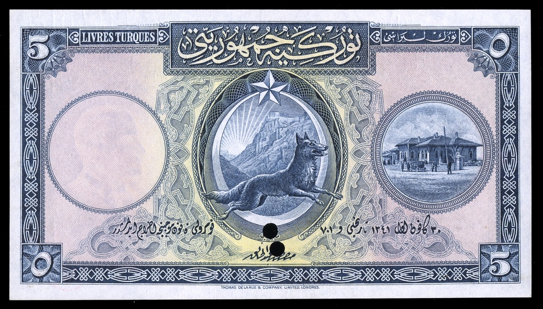 Turkey. Republic. Ministry of Finance State Notes. 5 Livres Law of AH 1341 (1926). P-120s. Specimen. Blue, yellow and pink. Gray wolf bounding at center, crescent and star framing Citadel of Ankara behind, House of Parliament at right; Stone bridge over Ankara Çayi river. Red oval DLR stamp back bottom right, double punch cancel lower center. Choice Uncirculated.