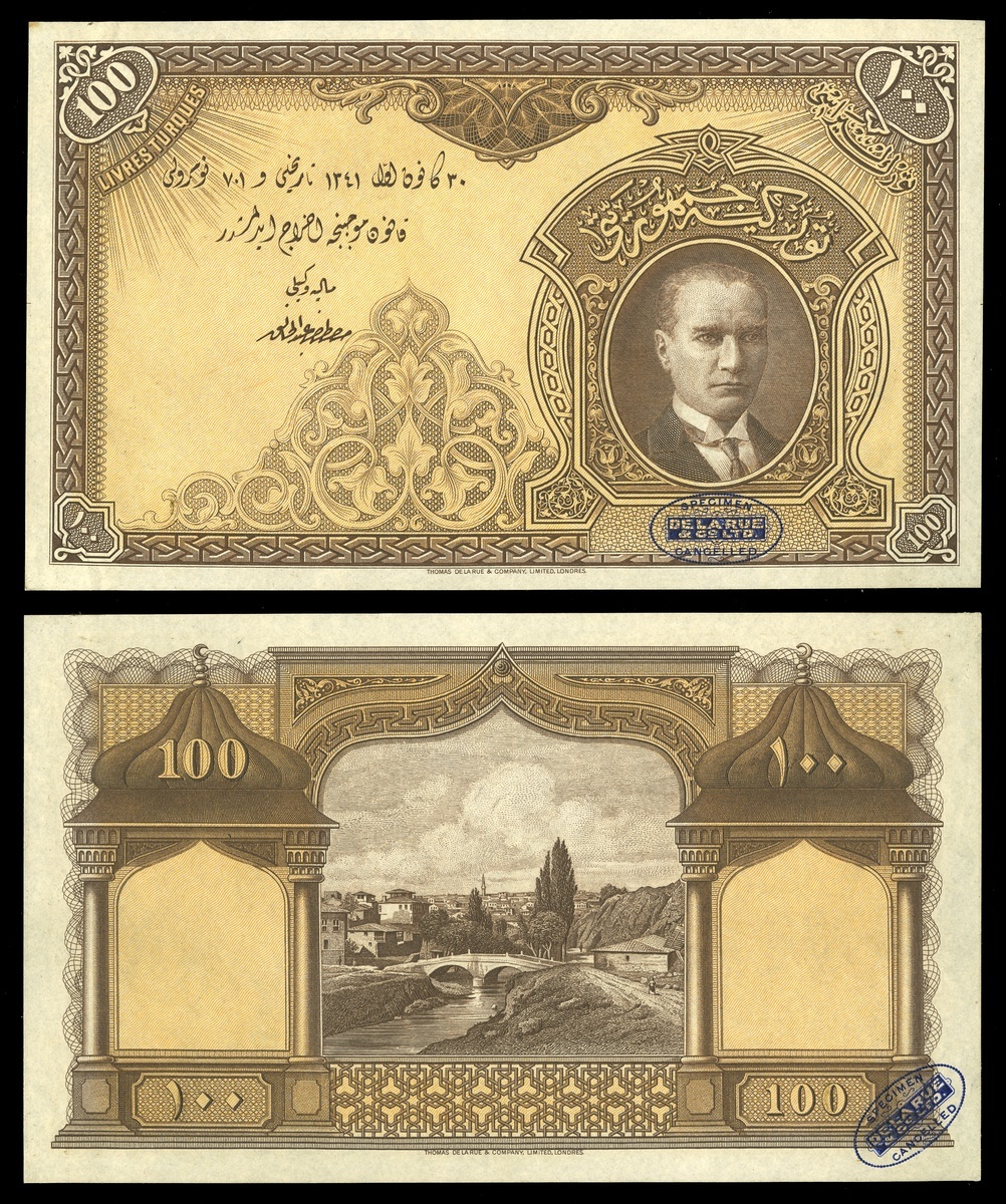 Turkey. Republic. Ministry of Finance State Notes. 100 Livres Law of AH 1341 (1926). P-123ctp. Color Trial Front and Back Proofs. Brown and light brown. Arabesque at lower center, portrait of Kemal Ataturk in frame at right; Stone bridge over river in Ankara on back. Blue oval DLR stamp bottom left. Very light trace of mounting on blank side. Uncirculated.